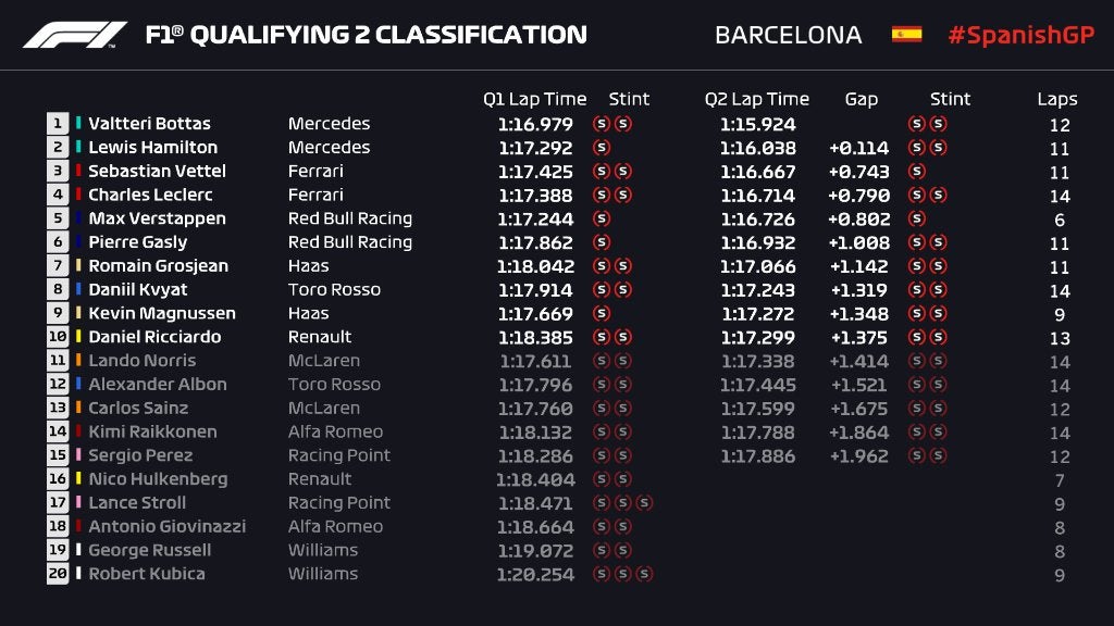 Checo Pérez tendrá que iniciar el Gran Premio de España en el lugar número 15, tras registrar un tiempo de 1:17:886 en la segunda ronda de clasificación (Q2), lo que generó que no pudiera avanzar a la siguiente etapa. El representante de la escudería Racing Point logró evitar el primer corte en la primera sesión, luego de haber regisrado un tiempo 1:18:286. Pérez se encuentra por el momento como sexto lugar en el Mundial de la Fórmula Uno, tras cosechar por el momento 13 unidades. Asimismo, la cima es liderada por Valtterri Bottas (Mercedes) con 87 puntos, le sigue como segundo Lewis Hamilton (Mercerdes) con 86 y como tercero se encuentra Sebastian Vettel (Ferrari) con 52 puntos.