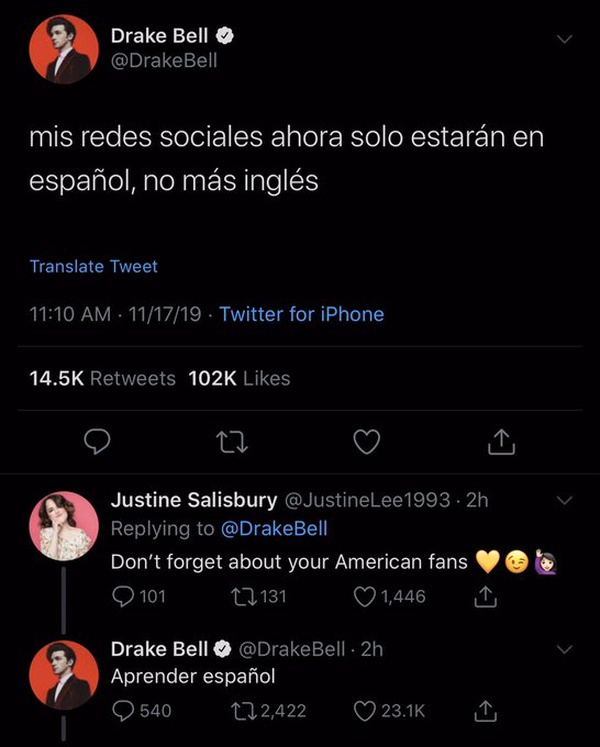 La mañana de hoy, el cantante estadounidense Drake Bell anunció en su cuenta de Twitter que sólo hablaría en español a través de sus redes sociales. Ante ello, incluso una usuaria le cuestionó que no usara el idioma inglés, a lo cual el actor de la serie Drake & Josh respondió que debería aprender la lengua de Cervantes.