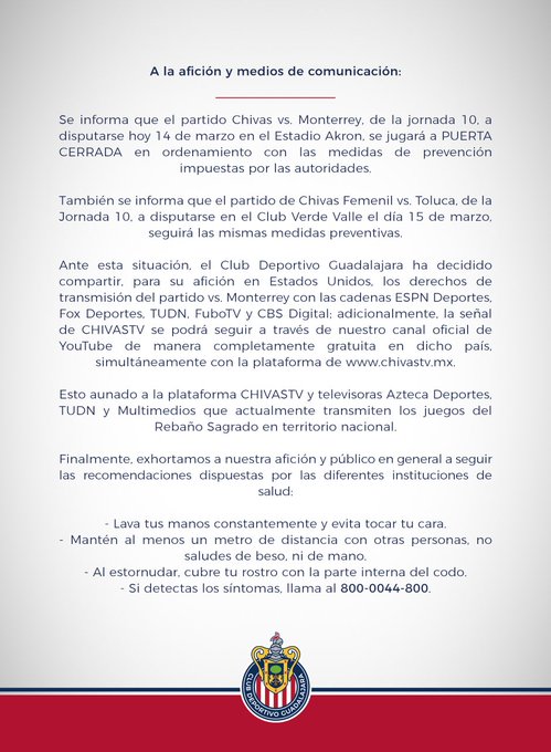 Deporte Nacional e InternacionalAnte el anuncio de la Liga MX, confirmando que el resto de partidos correspondientes a la jornada 10 del Clausura 2020 se disputarán a puerta cerrada para evitar la propagación del coronavirus en México, las Chivas decidieron abrir la transmisión de su duelo ante Rayados de Monterrey para las cadenas de Estados Unidos, facilitando así a sus aficionados el poder seguir el cotejo. Ante esta situación (el partido a puerta cerrada), el Club Deportivo Guadalajara ha decidido compartir, para su afición en Estados Unidos, los derechos de transmisión del partido contra Monterrey con las cadenas ESPN Deportes, Fox Deportes, TUDN, FuboTV y CBS Digital”, señaló Chivas a través de un comunicado.