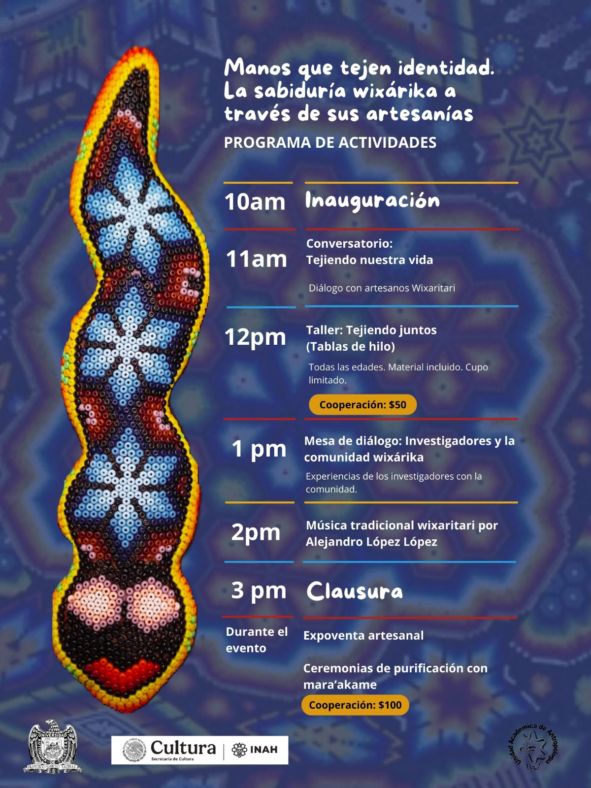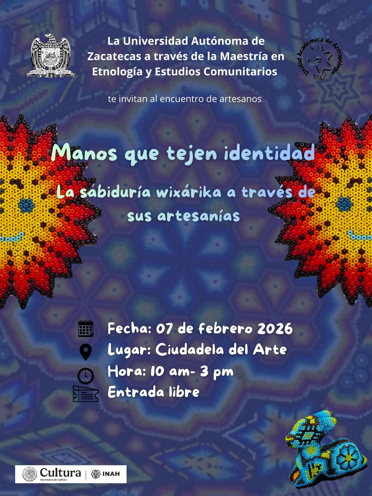 . Lisset Sarahí Esparza y María Guadalupe Cabral Cervantes, estudiantes de la Universidad Autónoma de Zacatecas (UAZ), coordinaron el proyecto “Manos que tejen identidad. La sabiduría wixárika a través de sus artesanías”. El programa incluye una serie de conferencias y talleres enfocados en la cultura de los wixaritari, que se realizarán el sábado 7 de febrero a partir de las 10 horas en la Ciudadela del Arte en la capital.