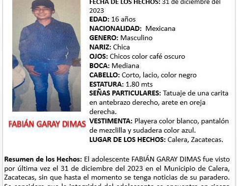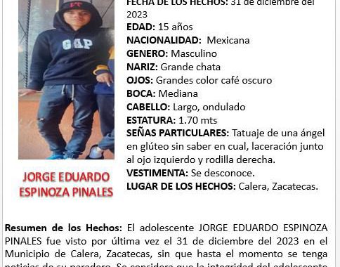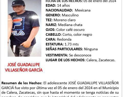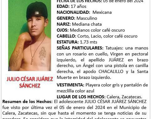 ZacatecasLa Fiscalía General de Justicia del Estado (FGJE) emitió la alerta Ámber y las cédulas de búsqueda de cuatro jóvenes, de entre 14 y 17 años reportados como desaparecidos en Calera de Víctor Rosales. Dos fueron vistos por última vez el 31 de diciembre y los otros dos el 5 de enero del año en curso. Se trata de Jorge Eduardo Espinoza Pinales, de 15 años y estatura de 1.70 metros. Tiene nariz grande, chata; ojos grandes café oscuro, boca mediana, cabello largo ondulado. Tiene el tatuaje de un ángel en un glúteo, laceración junto al ojo izquierdo y rodilla derecha. Asimismo, Fabián Garay Dimas, de 16 años y estatura de 1.80 metros. Es de nariz chica, ojos chicos café oscuro. Tiene el tatuaje de una carita en el antebrazo derecho y un arete en la oreja derecha. Vestía playera blanca, así como pantalón de mezclilla y sudadera azul. A ambos se les vio por última vez el 31 de diciembre de 2023. También, Julio César Juárez Sánchez, de 17 años y 1.73 metros de estatura. Rasgos: nariz mediana chata, ojos medianos café oscuro, cabello café oscuro, corto y lacio. Tatuajes: manos con un rosario en el cuello, virgen en pectoral izquierdo, el apellido Juárez en brazo derecho, un ángel con una pistola en canilla derecha, el apodo Chacalillo y la santa muerte en brazo izquierdo. Vestía playera gris y pantalón de mezclilla azul. Y José Guadalupe Villaseñor García, de 14 años y 1.73 metros de estatura. Es moreno claro, con nariz mediana, chata; ojos café oscuro, cabello negro, corto; cara redonda. A los dos se les vio por última vez el 5 de enero de 2024.